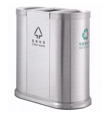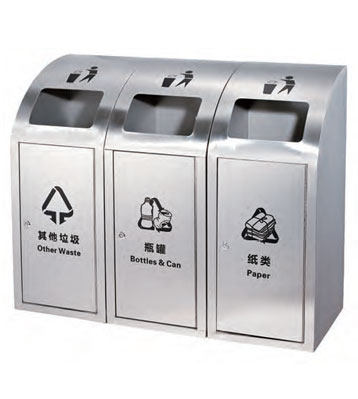 深圳新標準城中村街道社區不銹鋼五分類垃圾桶由有害垃圾、玻璃、金塑紙(為金屬、塑料、紙張的簡稱)、廚余垃圾、其他垃圾這5分類不銹鋼垃圾桶組合而成。其中金塑紙、其他垃圾日常產生量較大,所以分類收集容器也