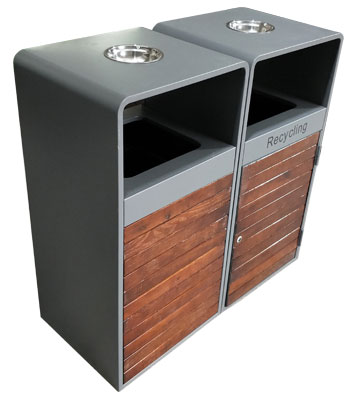 鋼木分類果皮箱桶頂嵌入煙灰盅,加入小石子可做戶外廣場等公共區域滅煙裝置及煙蒂收集使用,能減少環衛工清掃強度,圓弧邊角避免防撞,深灰色搭配鋼木顏色美觀大氣!