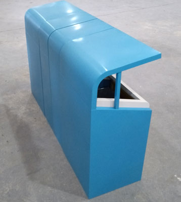 商業街戶外果皮箱S形創意外觀設計美觀,外筒采用足厚1.0mm優質冷軋鋼板噴塑烤漆、內膽為加厚鍍鋅板制作而成,防銹蝕能力升級10倍,正面開門箱門配三角鎖。